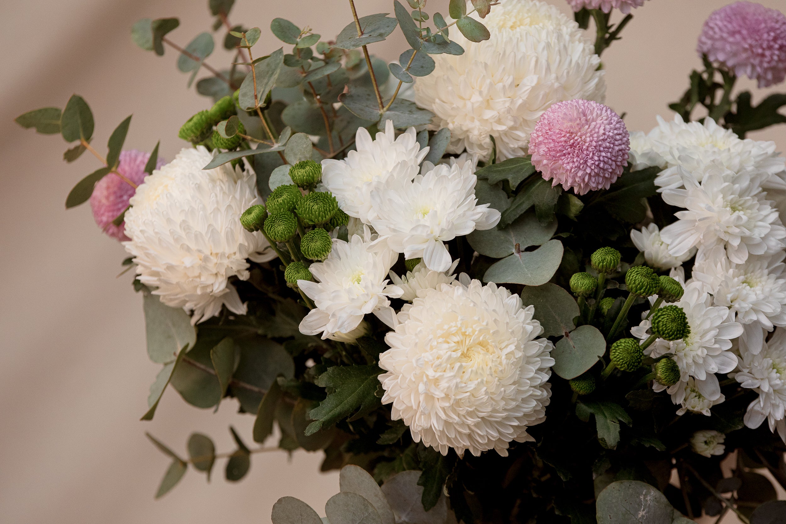 Combining the elegance of white and green flowers with a pop of pink, this is fun twist on a classic bouquet.