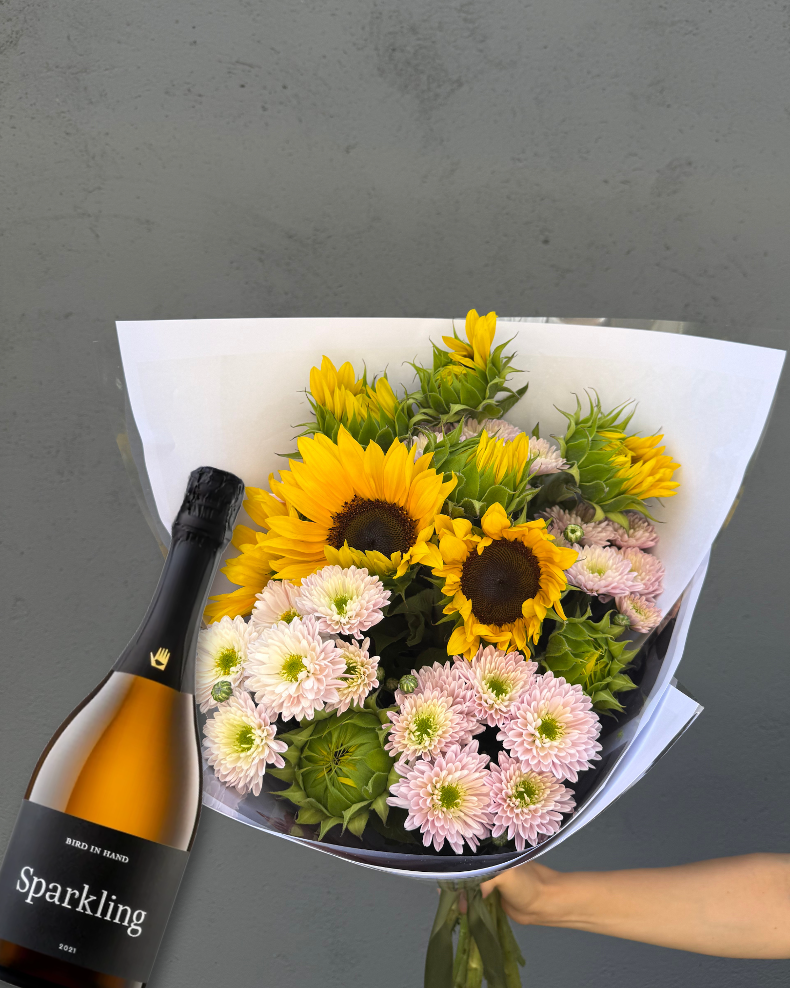 Bright, joyful, and made to celebrate — this package pairs our cheerful Sunflower Bouquet with a bottle of Bird in Hand Sparkling, creating the perfect gift for birthdays, congratulations, or just because.